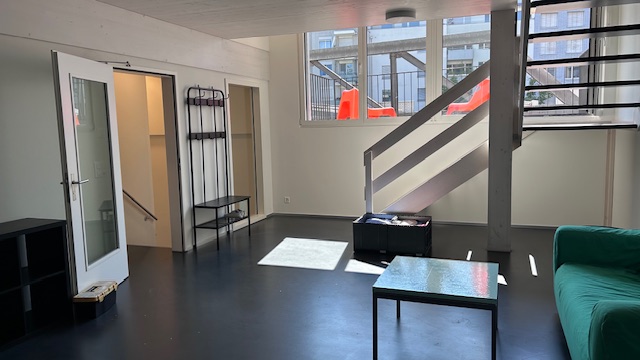 The large flat is located in the rear courtyard above a car garage.